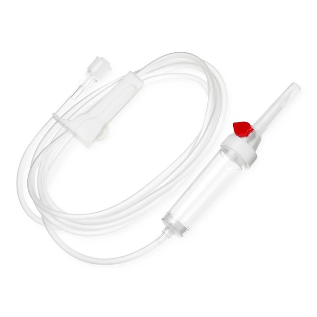 The administration set utilizes gravity-based infusion, with a 20 drops per mL drip rate for precise fluid control. A roller clamp allows for smooth flow regulation, ensuring accurate adjustment of infusion rates according to patient requirements. The set is equipped with a rotating male luer lock connector, facilitating secure and leak-free attachment to IV ports without compromising sterility.